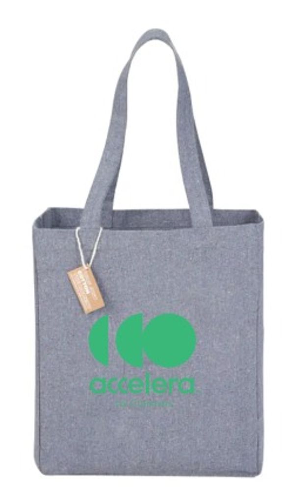 sku: 45657The Recycled 7oz Cotton Grocery Tote makes an eco-friendly alternative to plastic bags. The material contains recycled 7oz cotton collected from garment cutting waste blended with recycled polyester to produce a strong reusable bag. Through a partnership with 1% For The Planet, one percent of sales of EcoSmart products will be donated to nonprofits dedicated to protecting the planet.
